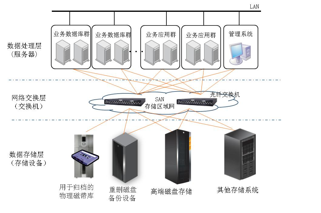 网络交换层,采用SAN交换机构成冗余和负载均衡的存储网络,由它来连接数据库/应用服务器到存储设备的数据访问,实现数据处理层和存储设备层的透明访问,同时数据处理层和存储设备层的设备,在统一SAN结构下,可以透明的横向扩展。