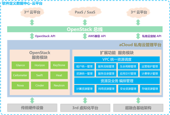 深信服aCloud私有云管理平台基于OpenStack架构,能够兼容第三方云平台,同时可以实现PaaS和SaaS的高级服务,整体系统架构如下图: