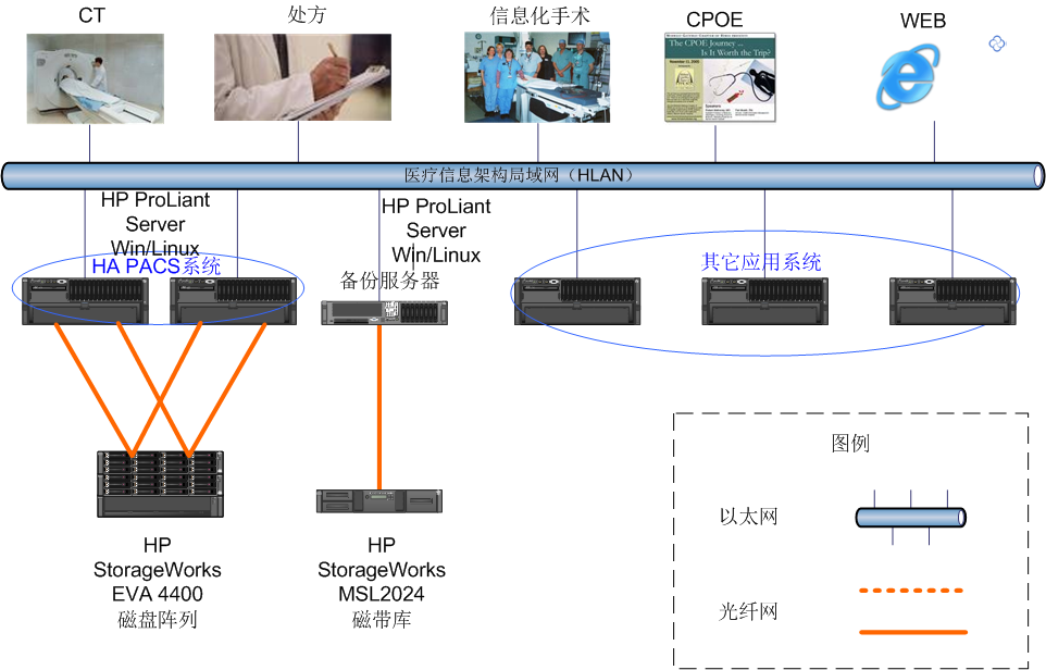 在本方案中,我们采用两台HP ProLiant服务器作为PACS数据库服务器,ProLiant服务器与功能强大的软件工具、集成解决方案、专业服务和存储设备完美结合在一起, 使各型企业都能够灵活适应变化,保存资源,并迅速响应客户需求。配置一台HP StorageWorks EVA4400 光纤磁盘存储作为SAN光纤存储设备。HPStorageWorks EVA4400是一款中高端存储产品,并且为业界第一台8Gb Ready光纤存储产品;由于采用了业界独有的虚拟化技术,其性能可以达到140,000 IOPS及1550MB/s的吞吐率。同时HP StorageWorks EVA4400还具备良好的扩展性,它最大能支持8个硬盘笼,96块硬盘,最大96TB裸容量。
